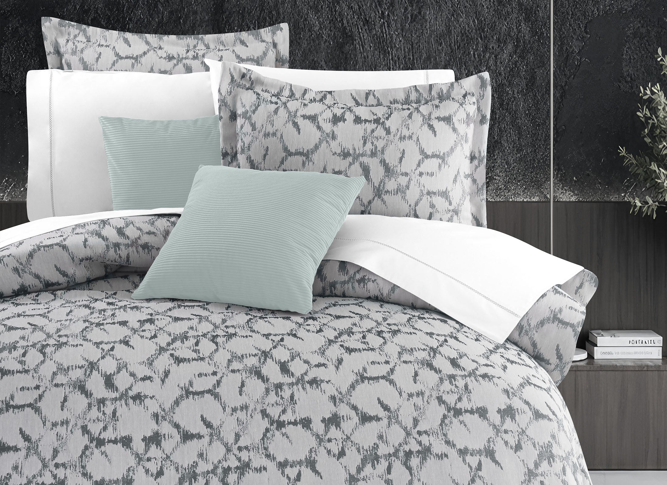 Formas irregulares en tono gris oscuro se entrelazan sobre un fondo claro, creando un diseño intrigante que evoca movimiento y profundidad. Cada figura se conecta con la siguiente en un juego visual sutil, dando a este Duvet una estética moderna y elegante. La combinación de tonos y texturas transforma cualquier espacio en un refugio de estilo contemporáneo y sofisticado