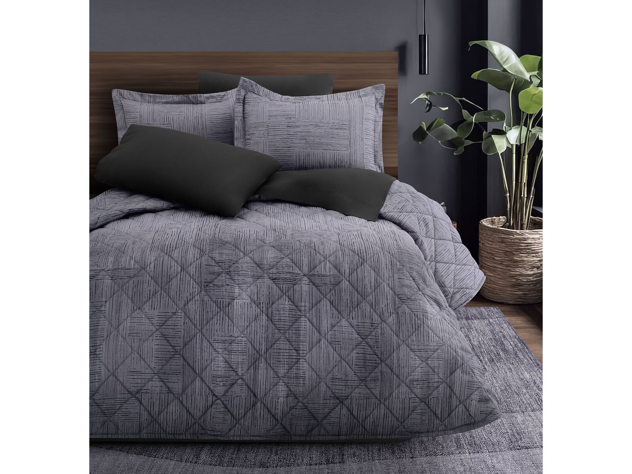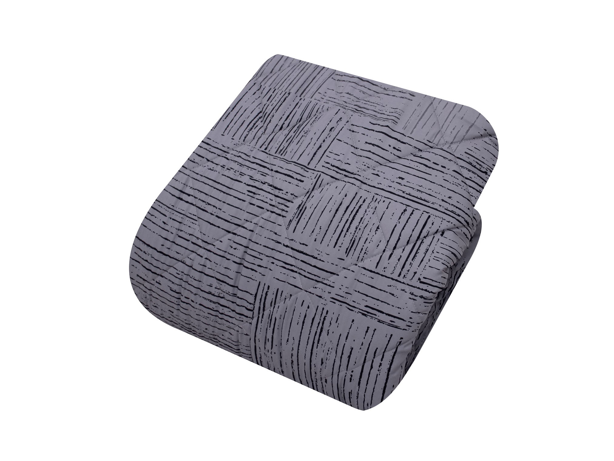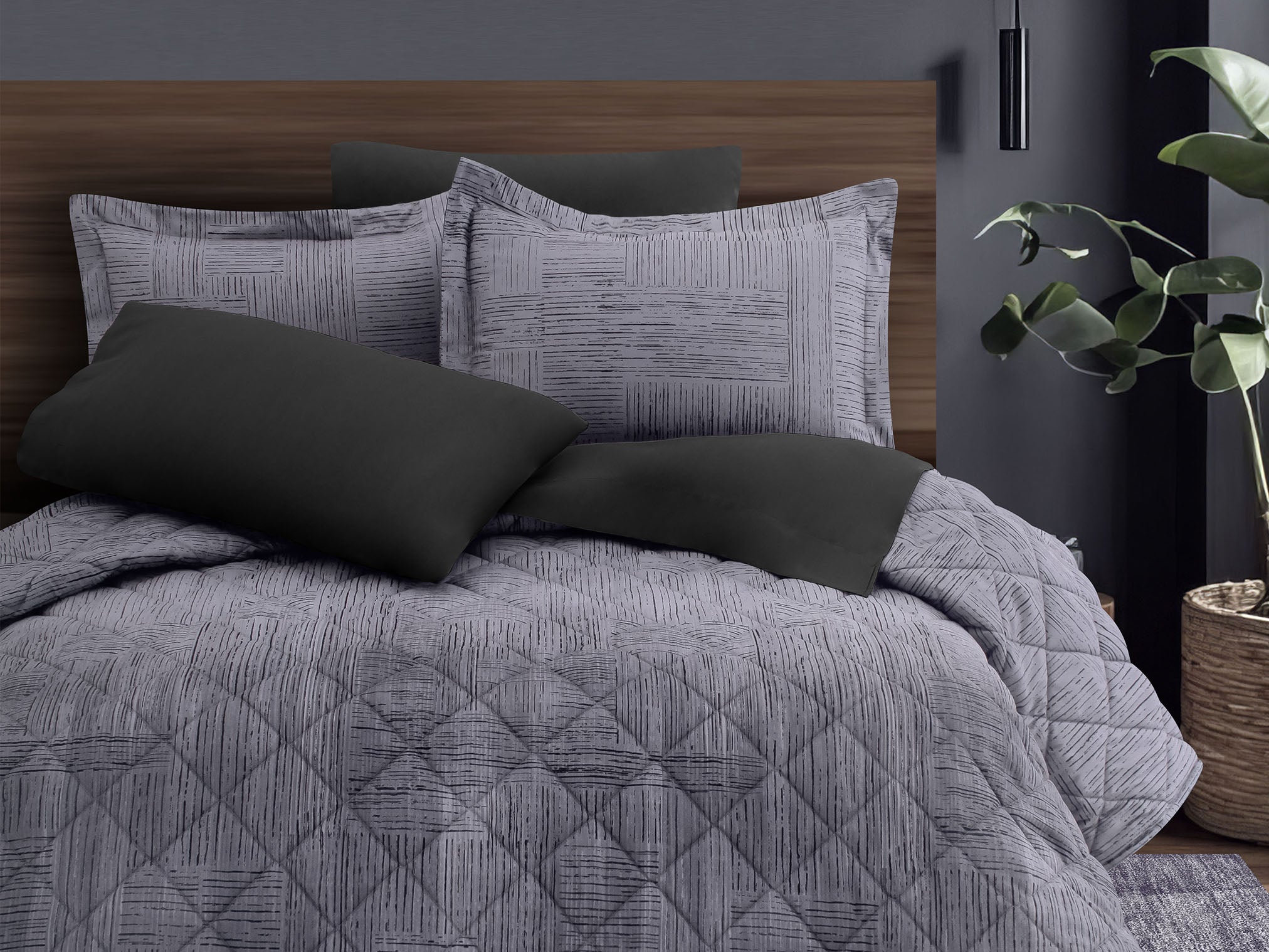 Delgadas líneas negras se entrelazan en perfecta simetría, formando un juego de trazos verticales y horizontales sobre un fondo gris sereno. Las cenefas, en sutil degradado, añaden un toque de movimiento suave, como si el diseño fluyera en armonía. Esta colcha equilibra lo moderno con lo atemporal, envolviendo tu espacio en una sofisticada elegancia donde el descanso se convierte en arte.