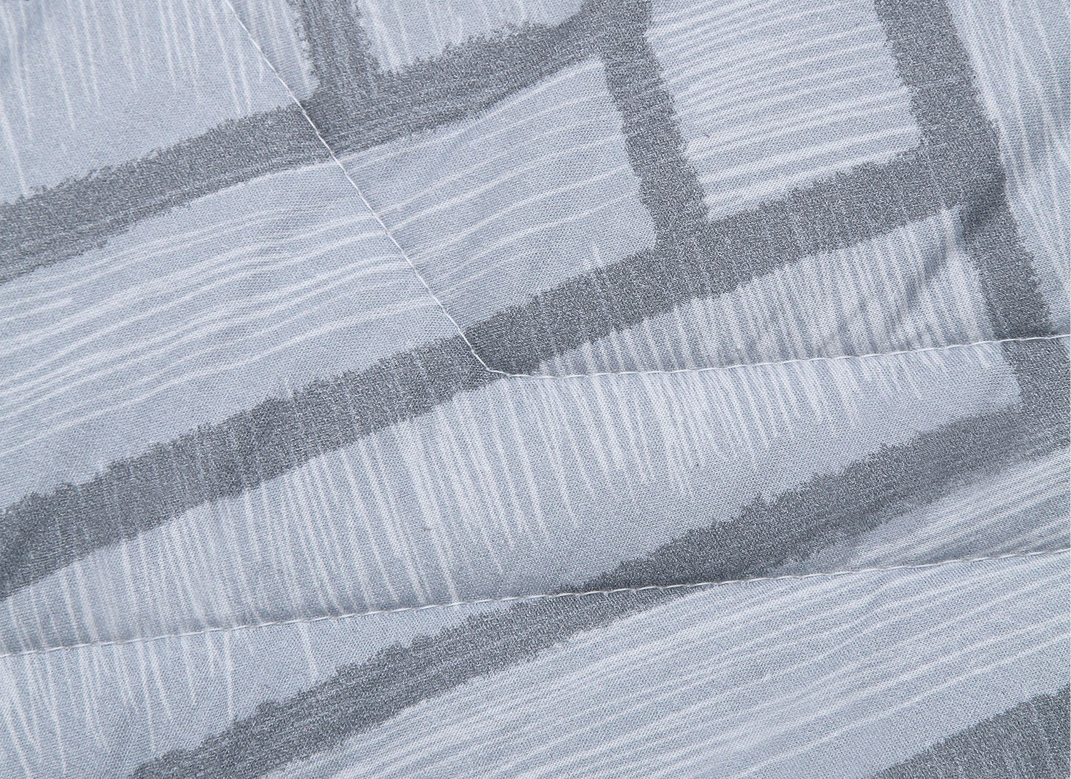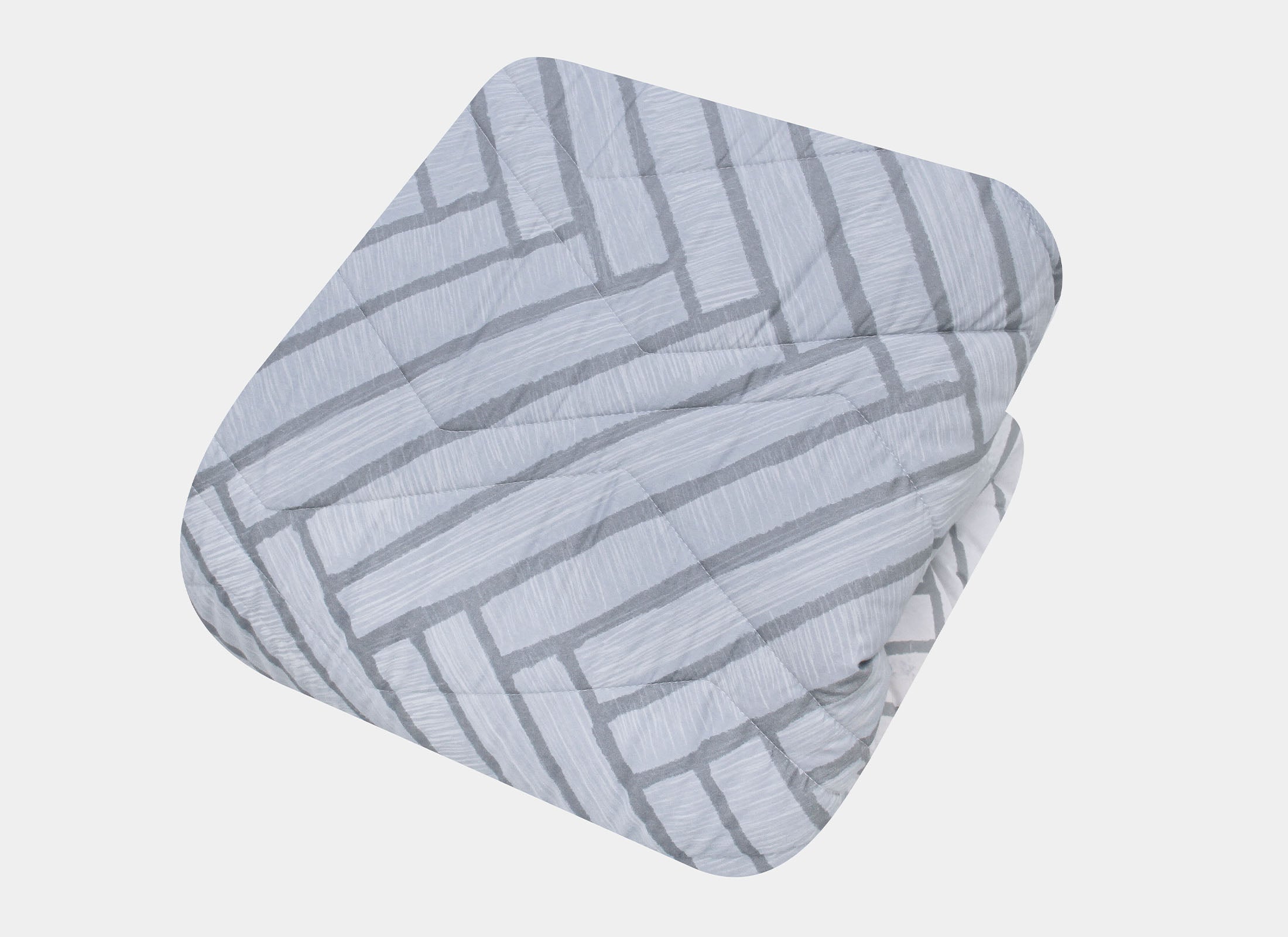 Déjate envolver por la sofisticación de la colcha y fundas decorativas Tanuk Acero. Su patrón de rectángulos diagonales contorneados en gris oscuro sobre un fondo de franjas horizontales en suaves tonos gris y blanco transforma tu espacio en un refugio moderno y lleno de estilo. La elegancia y la textura se unen para ofrecerte un descanso inigualable.