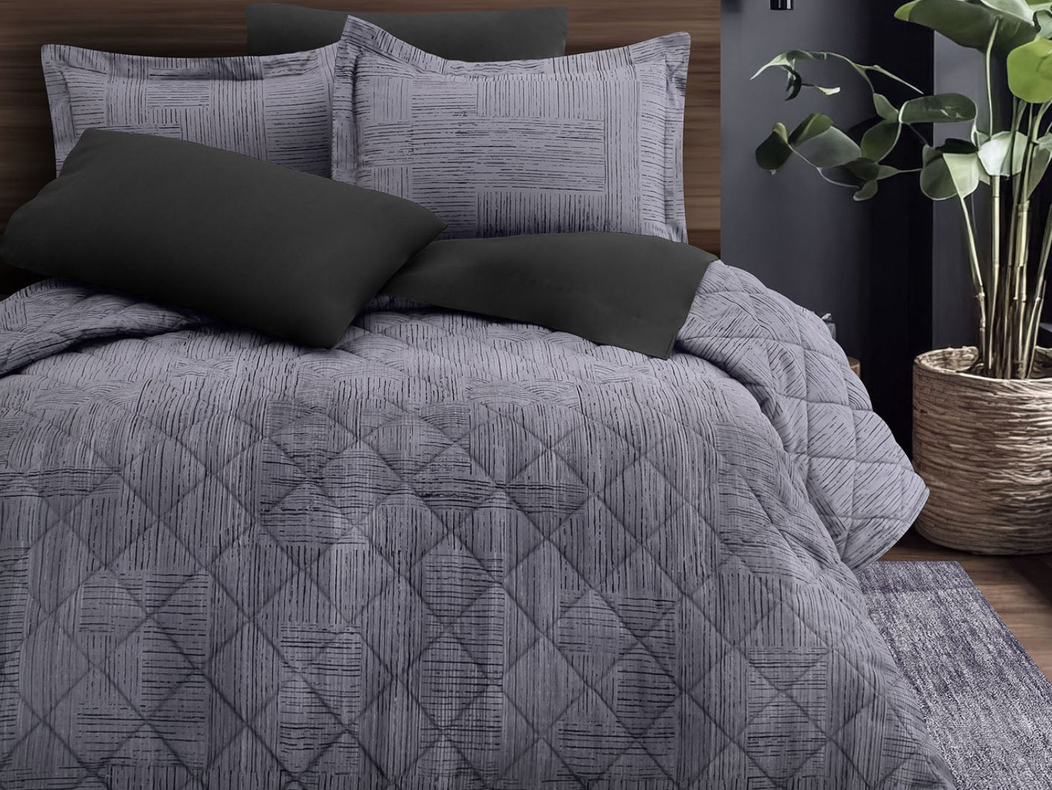 Delgadas líneas negras se entrelazan en perfecta simetría, formando un juego de trazos verticales y horizontales sobre un fondo gris sereno. Las cenefas, en sutil degradado, añaden un toque de movimiento suave, como si el diseño fluyera en armonía. Esta colcha equilibra lo moderno con lo atemporal, envolviendo tu espacio en una sofisticada elegancia donde el descanso se convierte en arte.