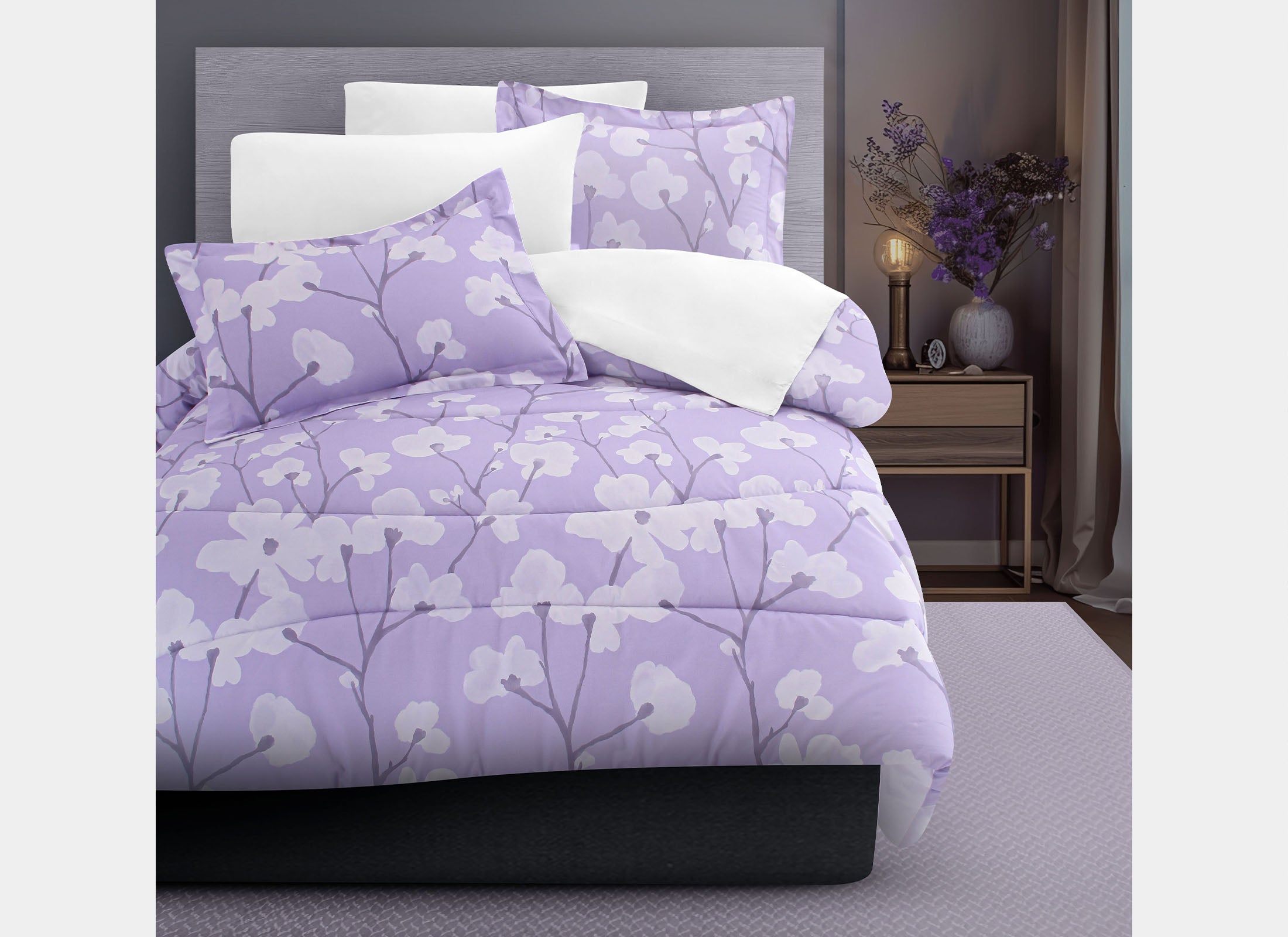 Delicadas flores blancas, como trazos suaves de acuarela, se alzan sobre tallos de un profundo morado, resaltando sutilmente sobre un fondo lila etéreo. Cada flor parece flotar en un lienzo de serenidad, invitando a un descanso envuelto en la elegancia de la naturaleza. Este edredón transforma cualquier espacio en un refugio de calma y sofisticación, donde los tonos suaves y las formas orgánicas se entrelazan en perfecta armonía.