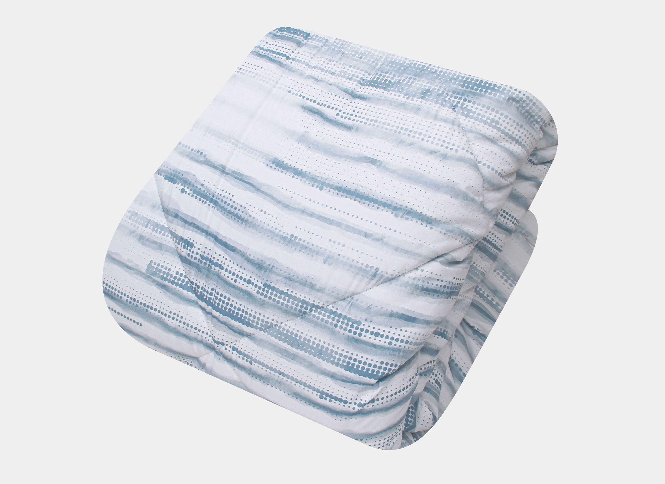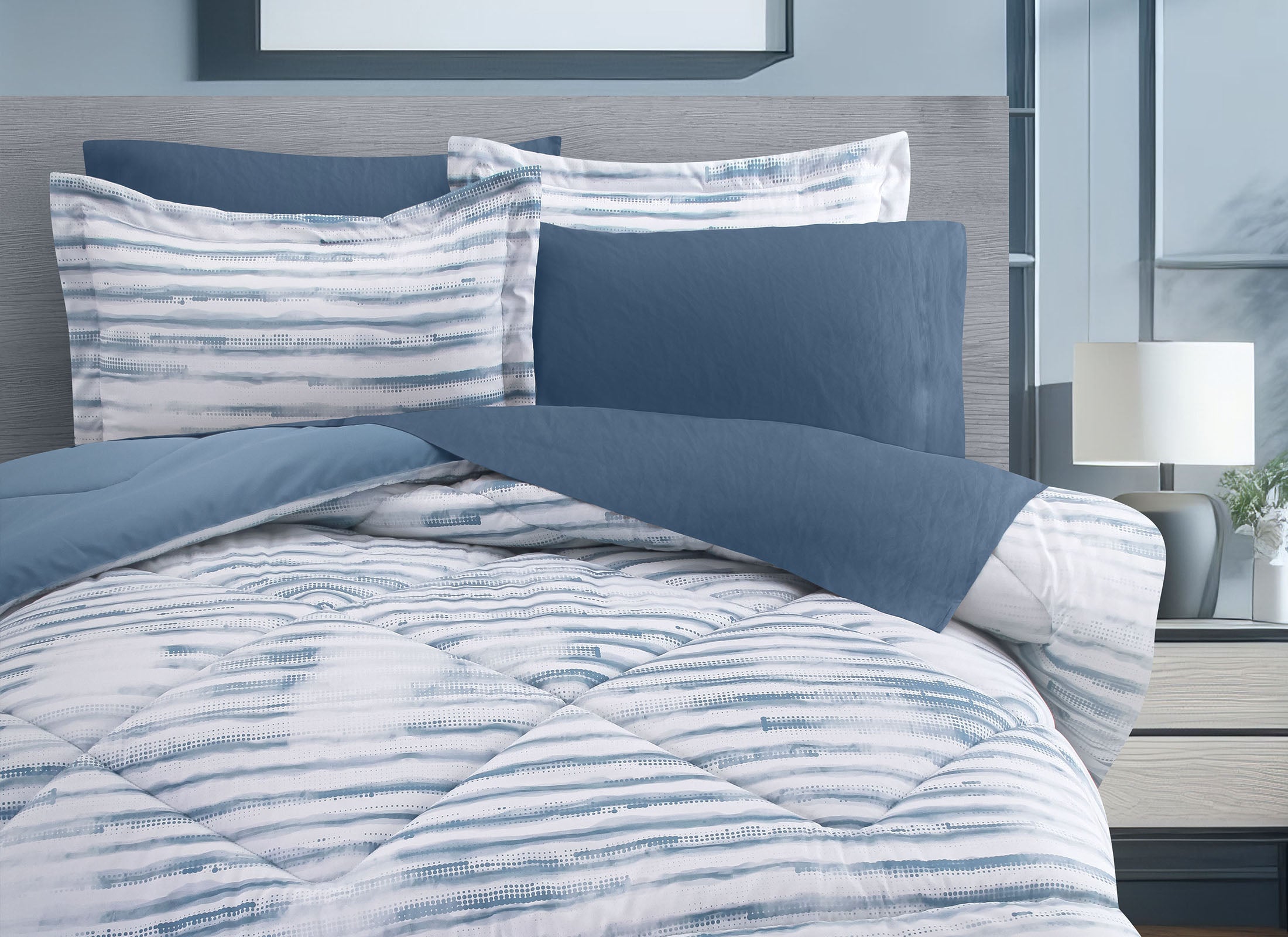 El Set Edsel de edredón y fundas decorativas aporta un toque artístico y relajante a tu habitación. Confeccionado en microfibra ultrasuave, presenta un diseño delicado de puntos en azul formando líneas horizontales, combinados con trazos tipo acuarela sobre un fondo blanco limpio. Ideal para quienes buscan suavidad inmediata y estilo sutil.