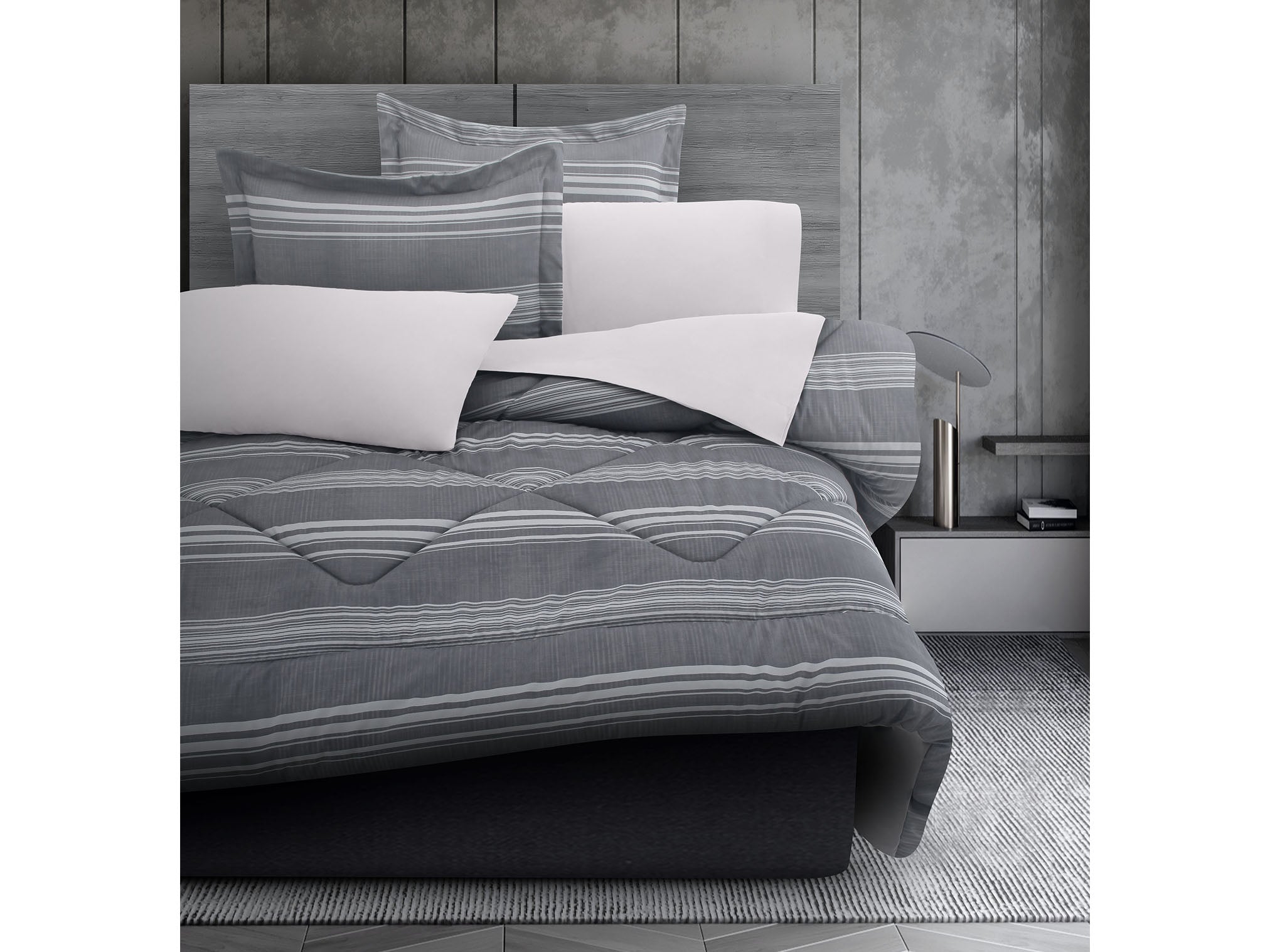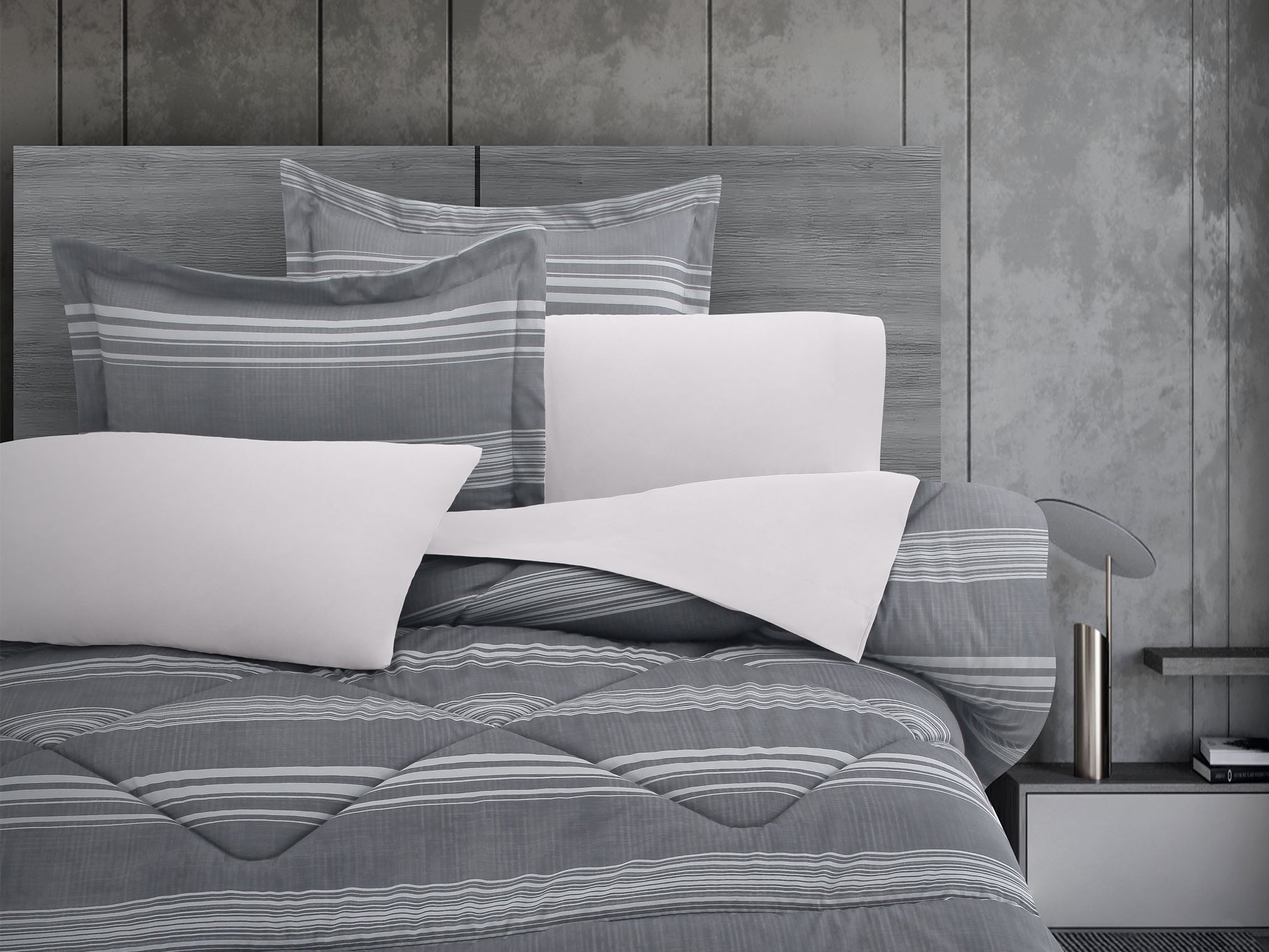 Franjas de líneas blancas, de diversos anchos, trazan su recorrido sobre un fondo gris con textura jaspeada, como si el viento dibujara su propio ritmo en la piedra. Este diseño, lleno de contraste y sutileza, evoca la serenidad de lo natural con un toque moderno. Un edredón que invita al equilibrio perfecto entre lo orgánico y lo contemporáneo, transformando tu descanso en una experiencia de elegancia y confort.