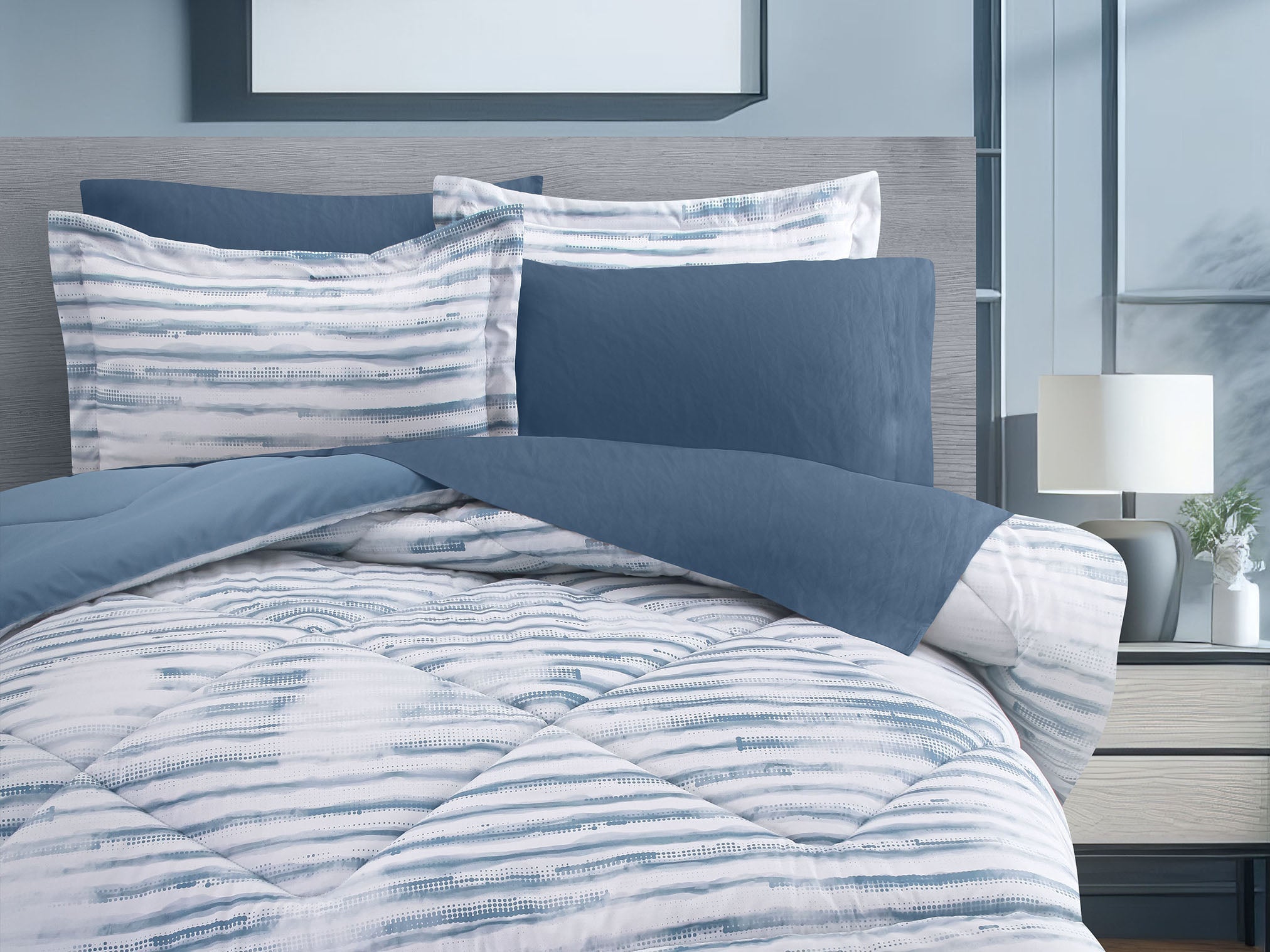 El Edredón Edsel aporta un toque artístico y relajante a tu habitación. Confeccionado en microfibra ultrasuave, presenta un diseño delicado de puntos en azul formando líneas horizontales, combinados con trazos tipo acuarela sobre un fondo blanco limpio. Ideal para quienes buscan suavidad inmediata y estilo sutil.