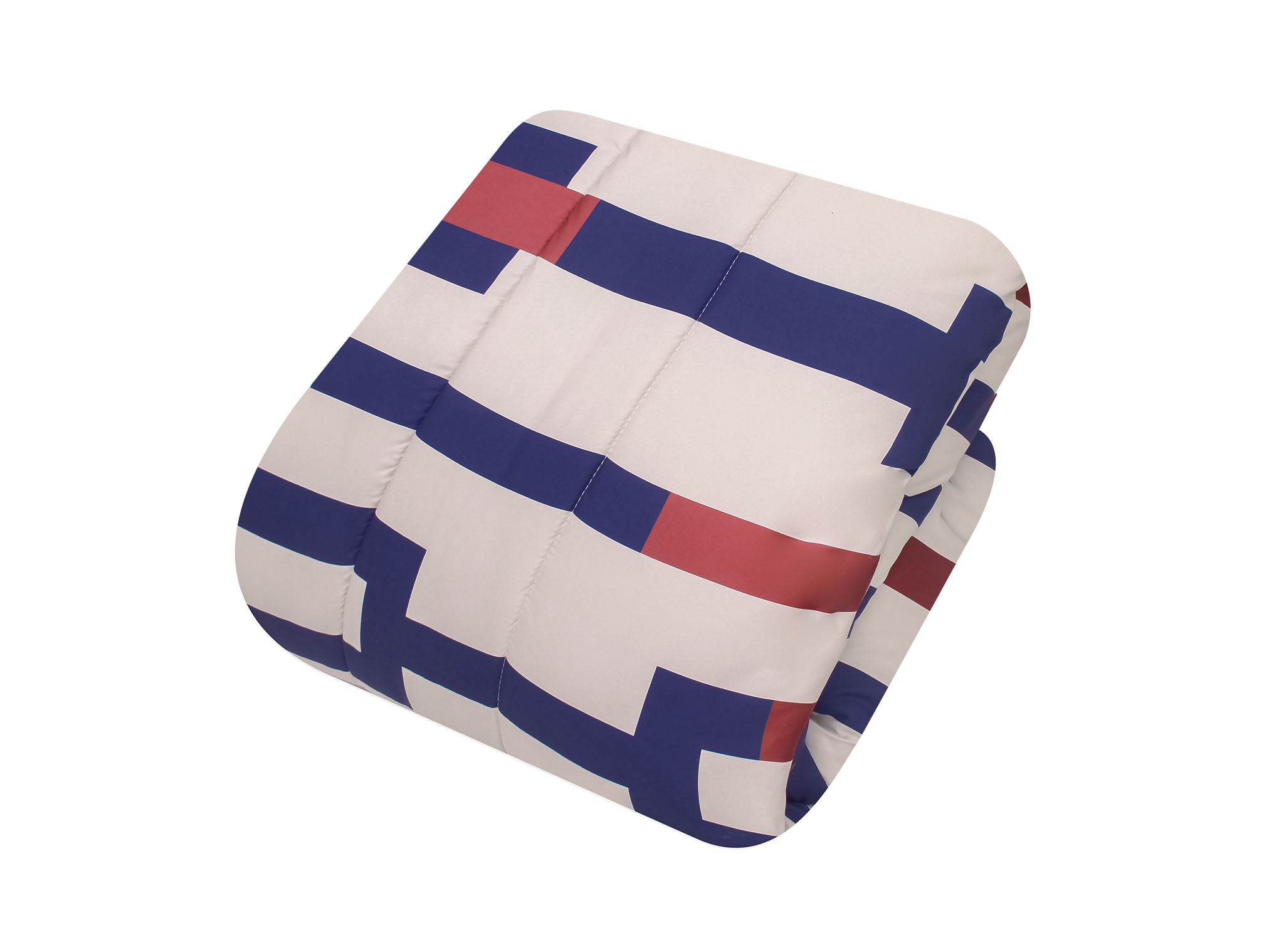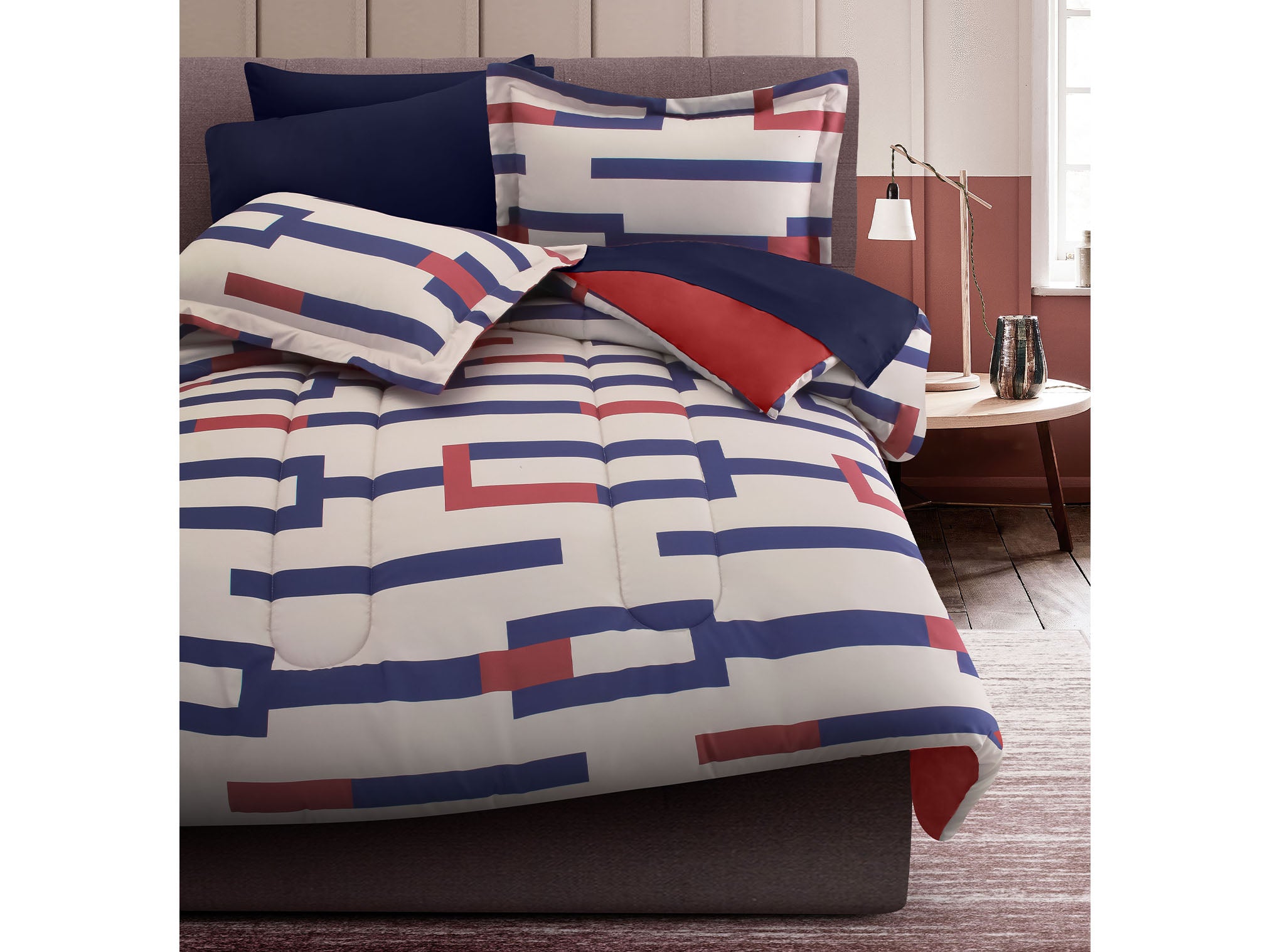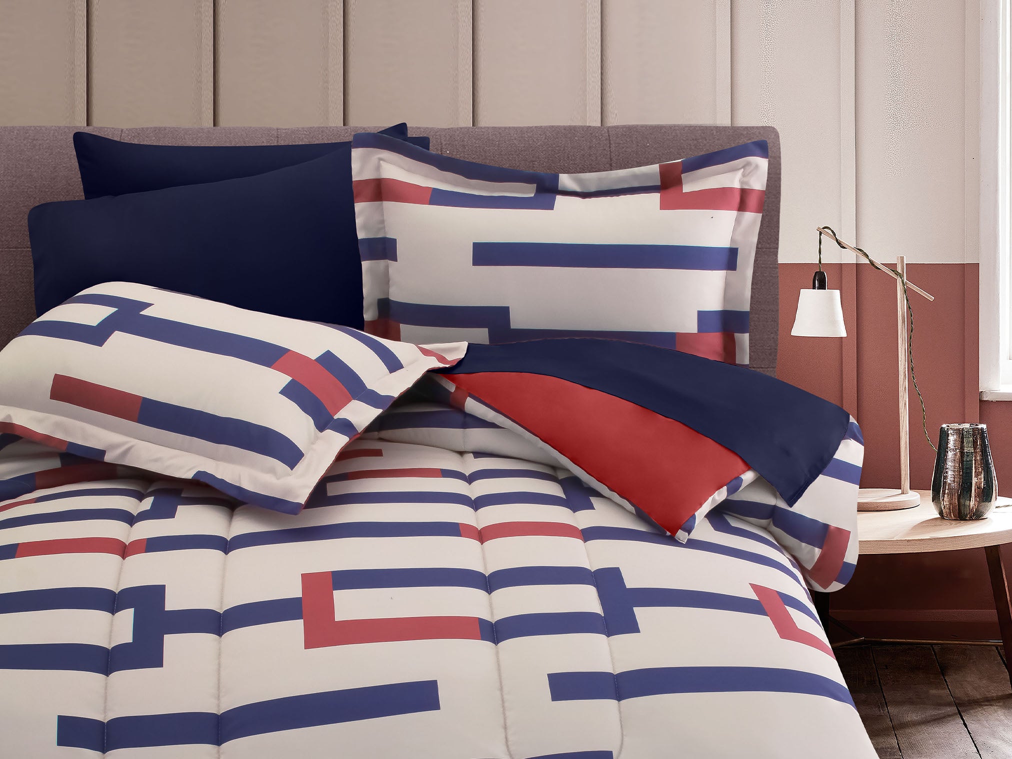 El Edredón Italo Azul destaca por su diseño moderno de líneas y rectángulos en azul y vino sobre fondo crema. Confeccionado en microfibra, ofrece suavidad, ligereza y gran durabilidad.