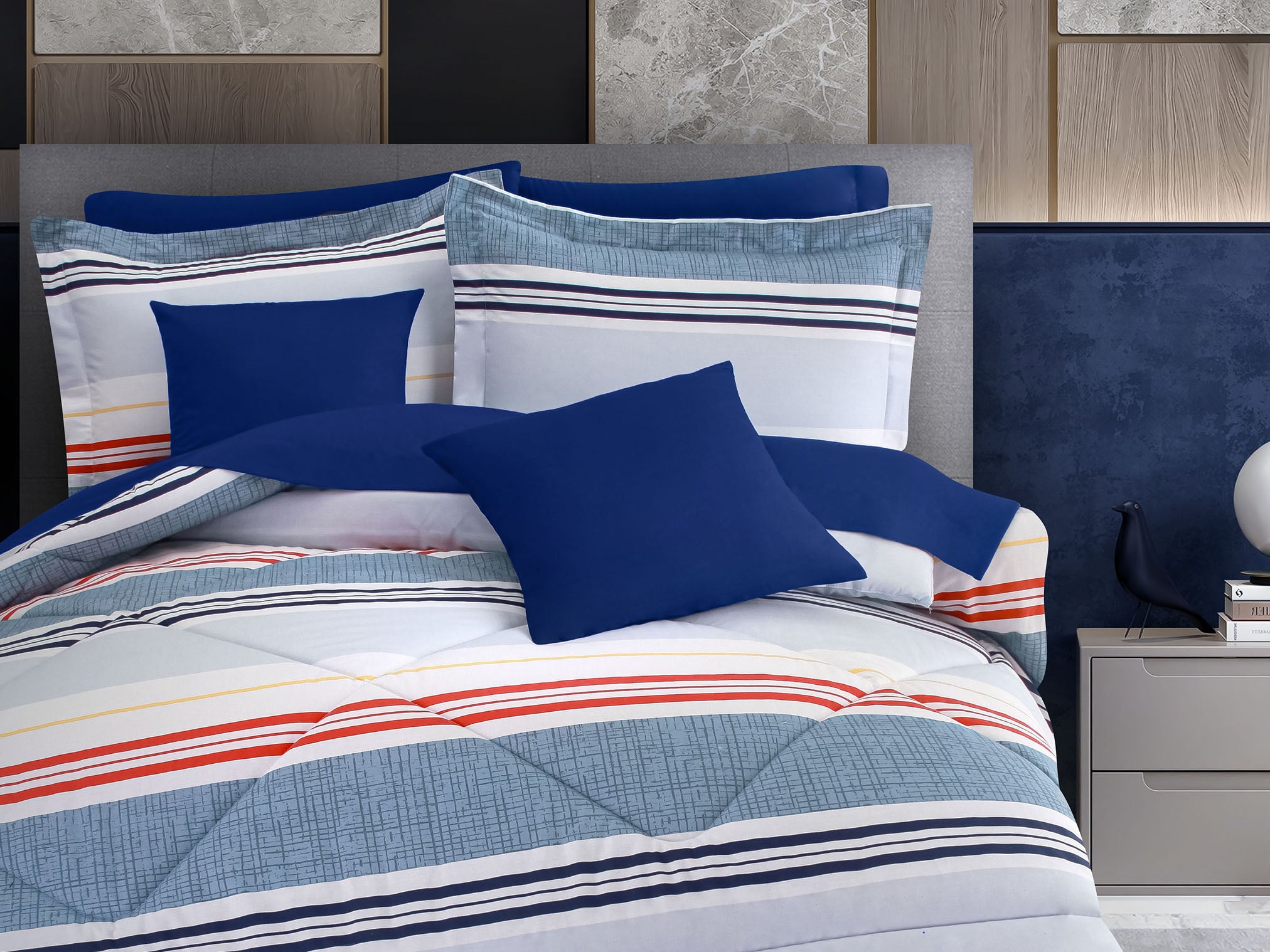 Un juego de bloques horizontales se despliega en tonos que van desde el azul bebé hasta el azul acero texturizado, creando un efecto visual sereno y moderno. Las líneas en tonos de azul, rojo y amarillo se alternan, aportando energía y dinamismo sobre el fondo blanco. Este patrón evoca la frescura de una mañana clara y la calidez de una paleta vibrante pero equilibrada. Cada color y línea cuenta una historia de armonía, donde el azul calma y los toques de rojo y amarillo despiertan el diseño. Ideal para quienes buscan un equilibrio perfecto entre serenidad y vitalidad.