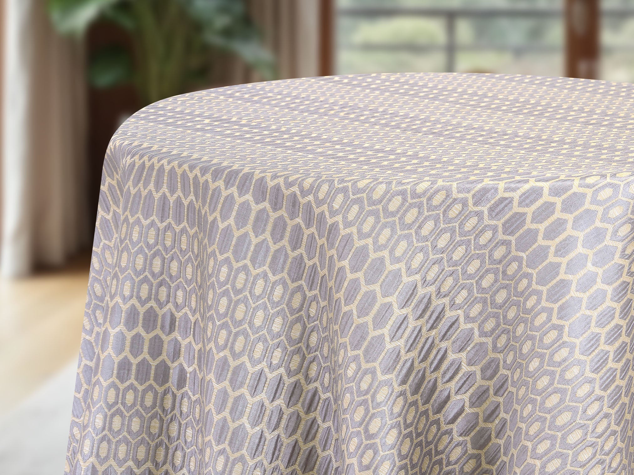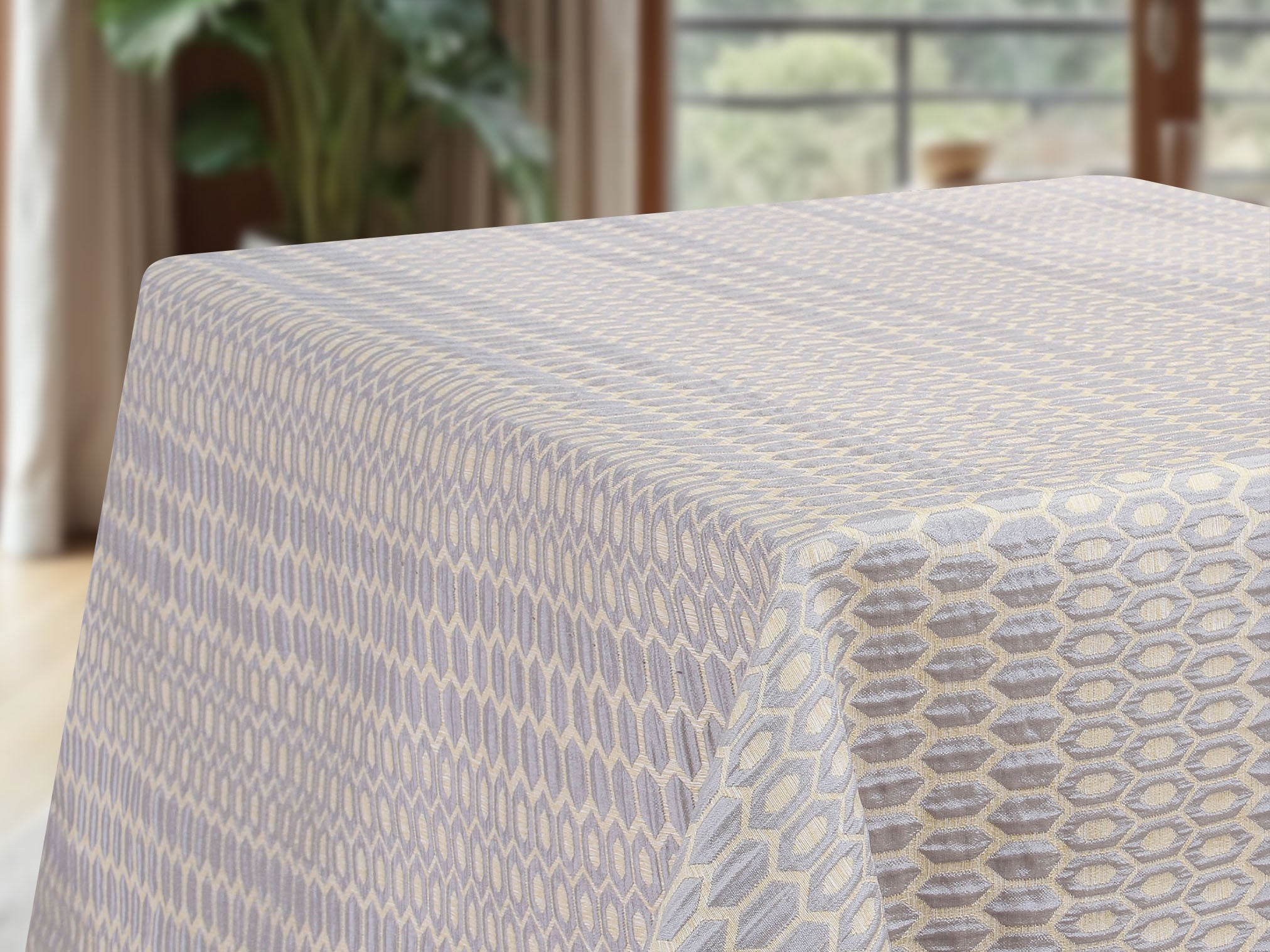 Un diseño moderno y sofisticado se despliega en tu mesa: jacquard de hexágonos alargados en gris claro sobre un fondo jaspeado en tono arena. Un patrón que evoca elegancia y dinamismo, aportando textura y profundidad a tu espacio. Dale a tu hogar un toque único de estilo contemporáneo, donde cada detalle refleja armonía y buen gusto.