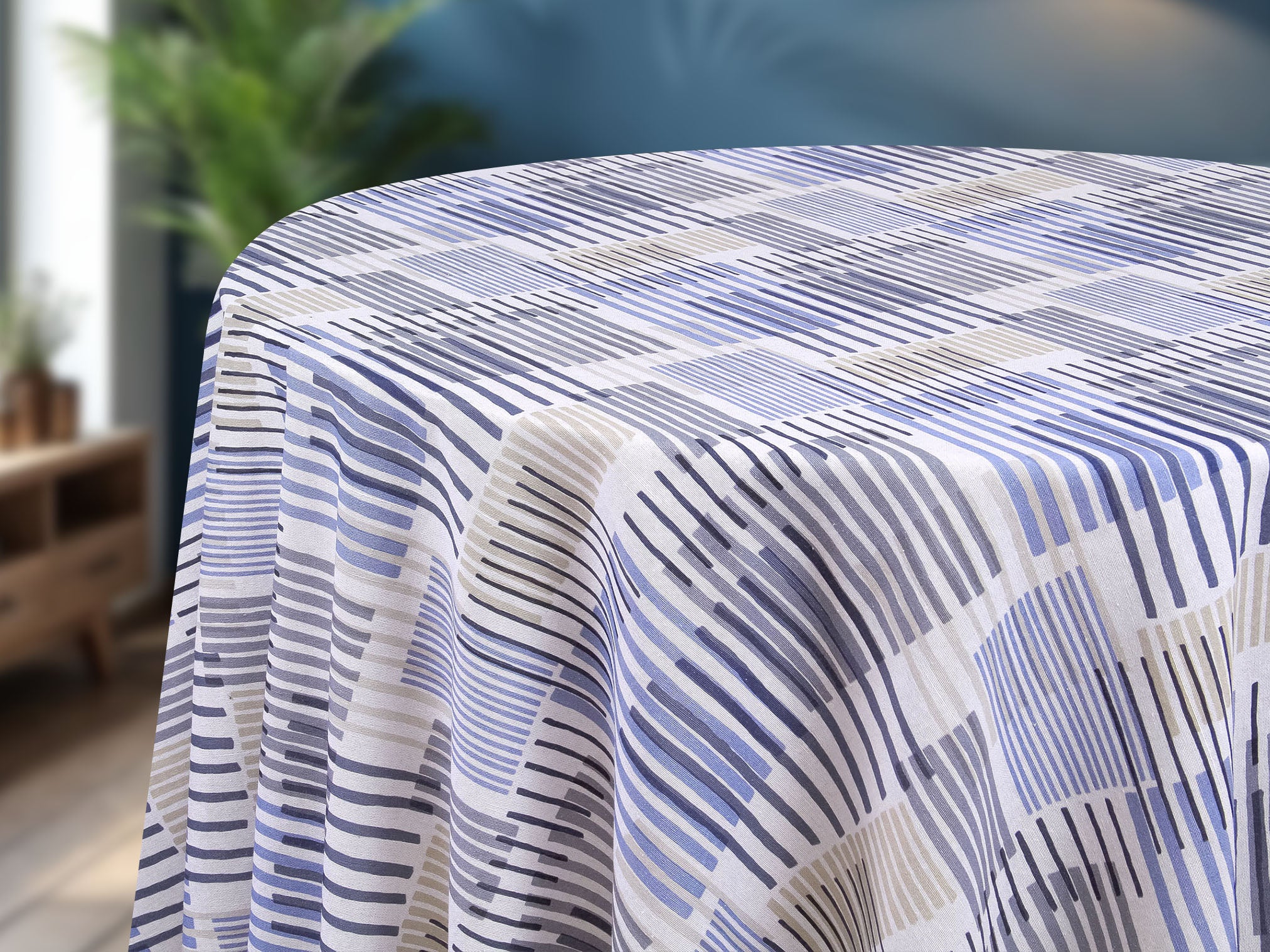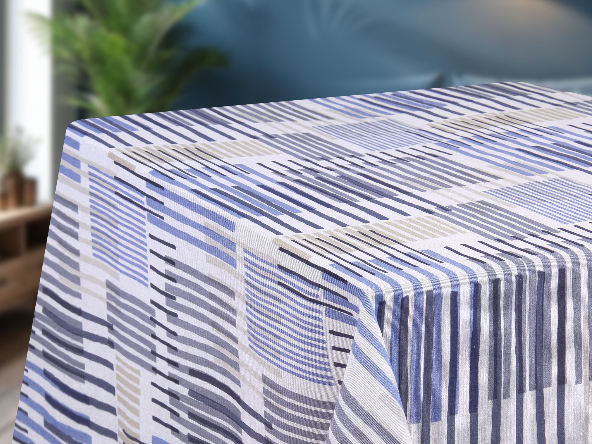 Un juego de elegancia y movimiento se despliega en tu mesa: líneas verticales en tonos de azul, gris y arena que se entrelazan suavemente sobre un fondo blanco. Un diseño moderno y sofisticado que aporta profundidad y frescura, convirtiendo cualquier espacio en un lugar lleno de estilo. Dale a tu hogar un aire contemporáneo y lleno de armonía con esta pieza única y encantadora.