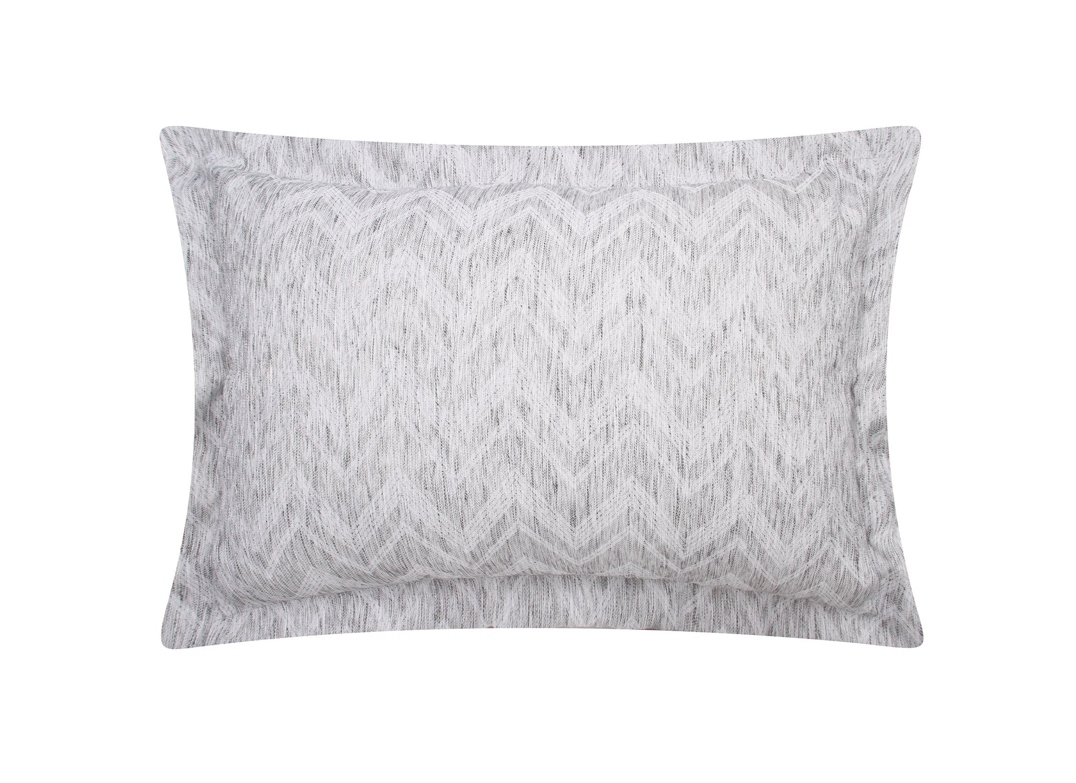 Un almohadón que redefine la elegancia. Su patrón de zigzags en tonos de gris, combinado con un sutil jaspeado blanco y gris oscuro sobre un fondo gris claro, crea un equilibrio perfecto entre estilo y sofisticación. Un detalle que realza tu espacio y envuelve cada momento de descanso en distinción.