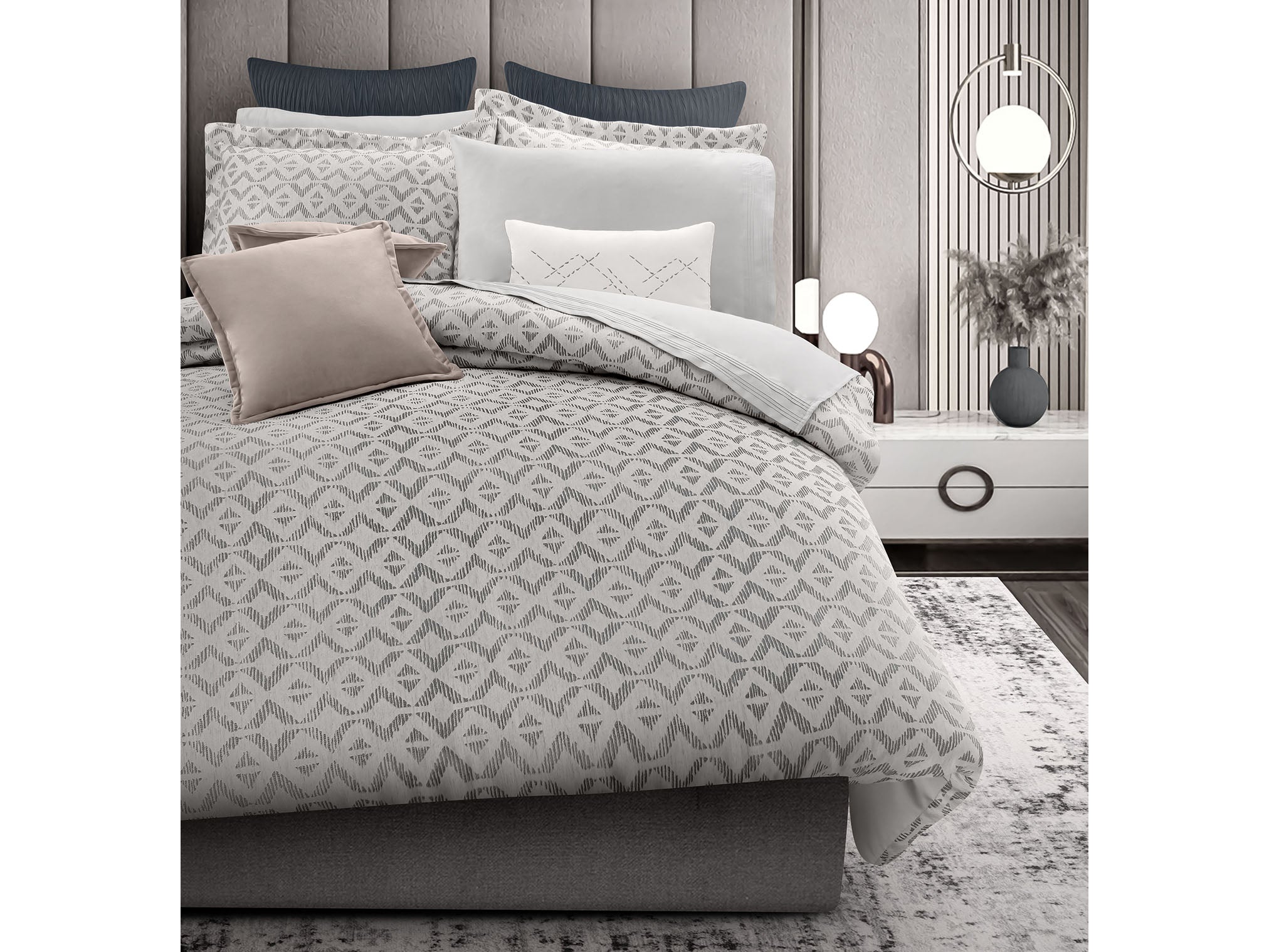 Auri es el Duvet que transformará tu espacio. Su patrón de zigzags horizontales que forman rombos en un tono gris sobre un fondo crudo ofrece una elegancia moderna y sutil. Ideal para quienes buscan un diseño sofisticado que se adapte a cualquier estilo, aportando confort y un toque único a tu habitación. ¡Hazlo tuyo hoy!