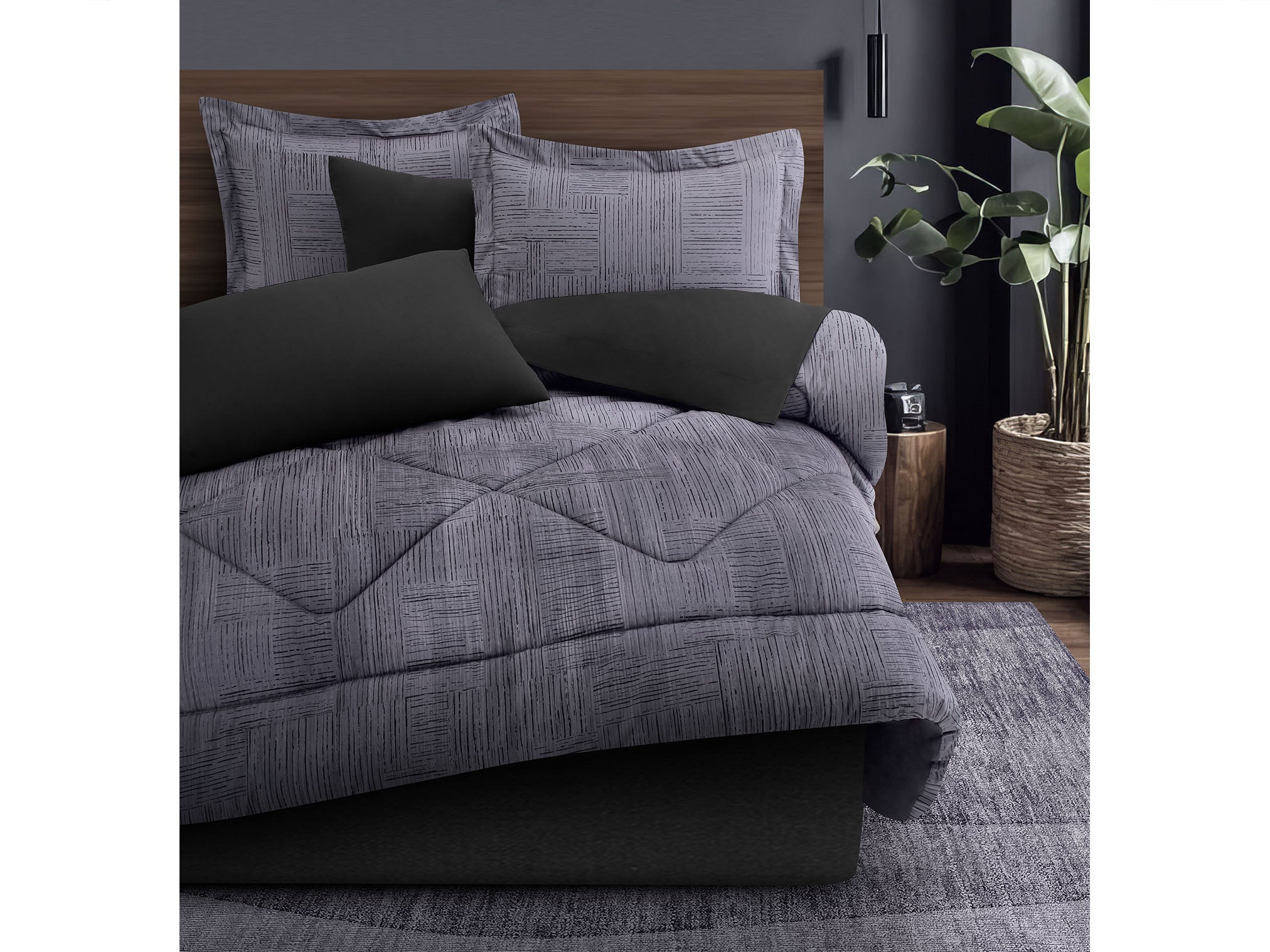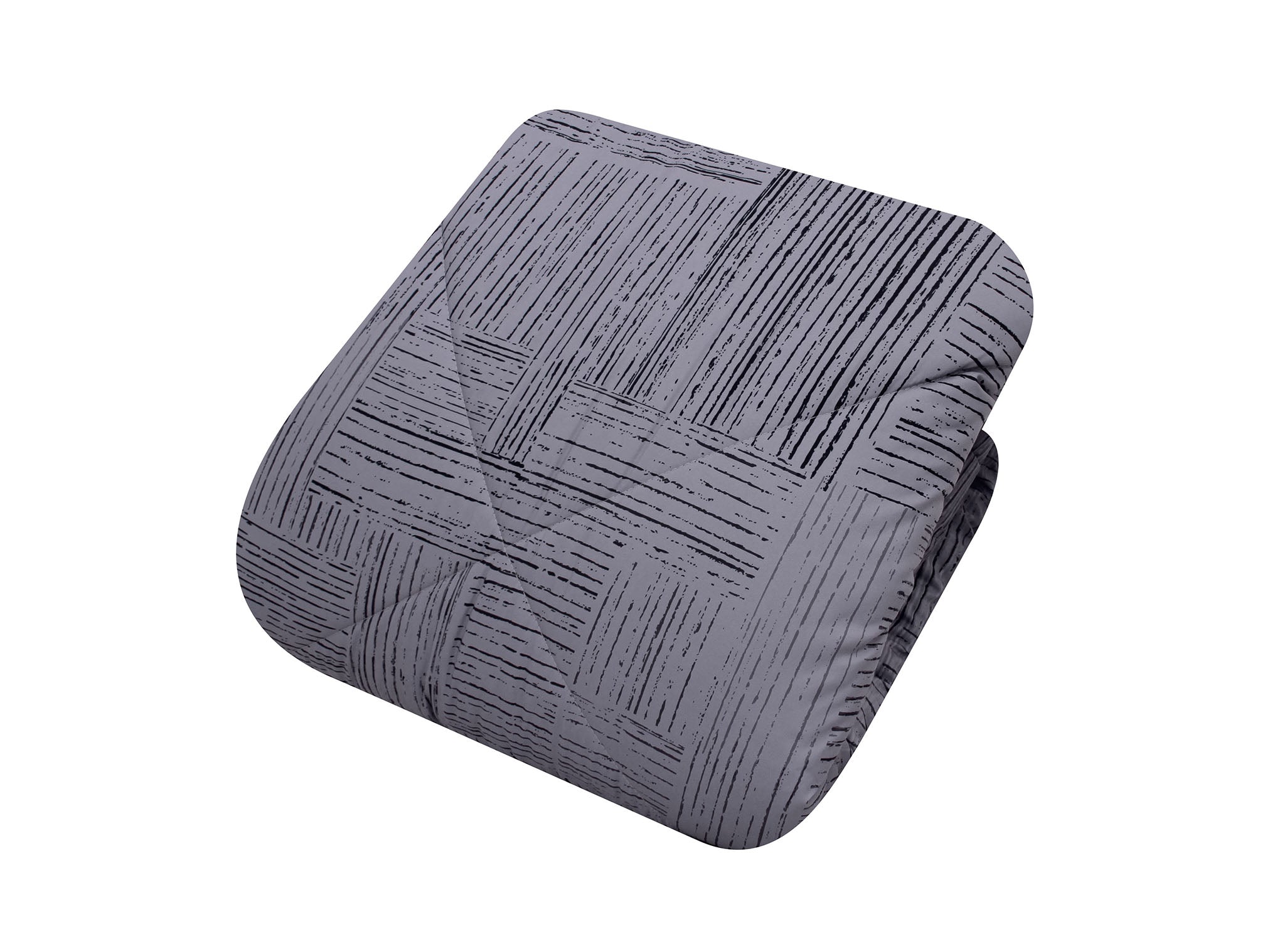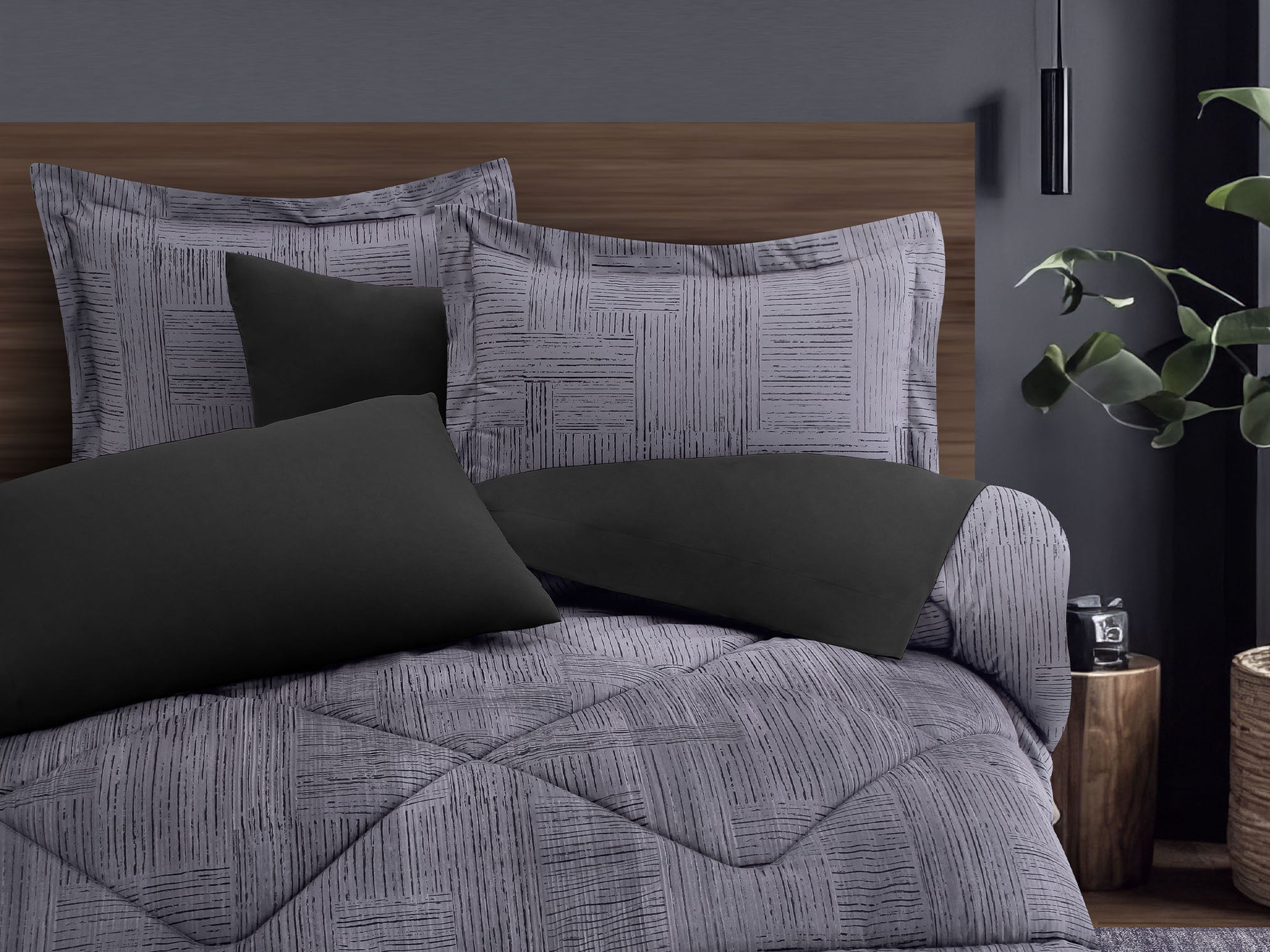 Delgadas líneas negras se entrelazan en perfecta simetría, formando un juego de trazos verticales y horizontales sobre un fondo gris sereno. Las cenefas, en sutil degradado, añaden un toque de movimiento suave, como si el diseño fluyera en armonía. Este edredón equilibra lo moderno con lo atemporal, envolviendo tu espacio en una sofisticada elegancia donde el descanso se convierte en arte.
