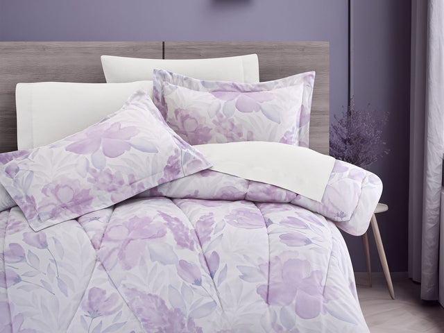 Sobre un fondo blanco puro, florecen sutiles flores lila, abrazadas por hojas y tallos que despliegan delicados matices de morado y gris. Este diseño evoca la calma de un amanecer suave, donde cada detalle te invita a sumergirte en una atmósfera de serenidad y elegancia. Un edredón que transforma cualquier rincón en un refugio de paz y sofisticación.
