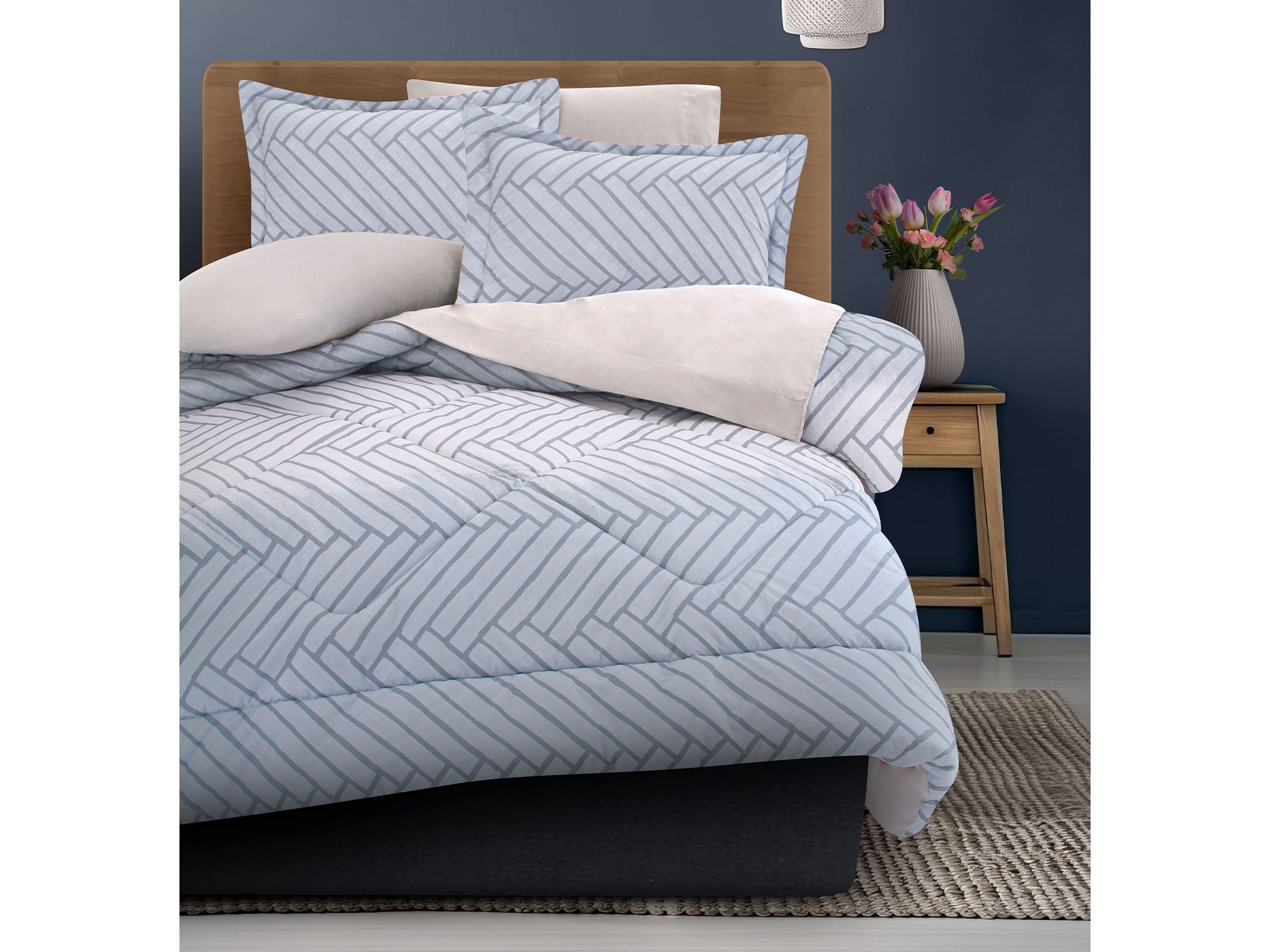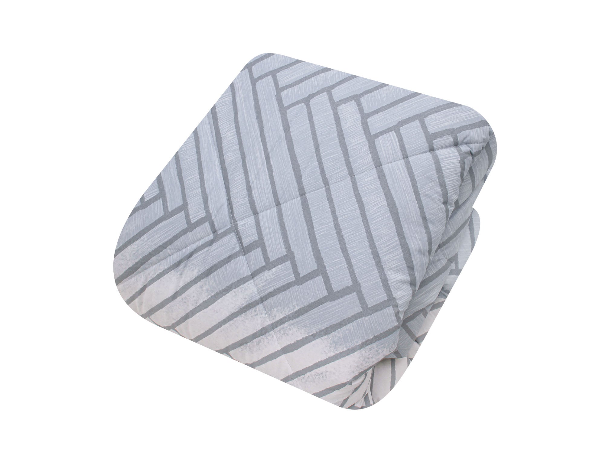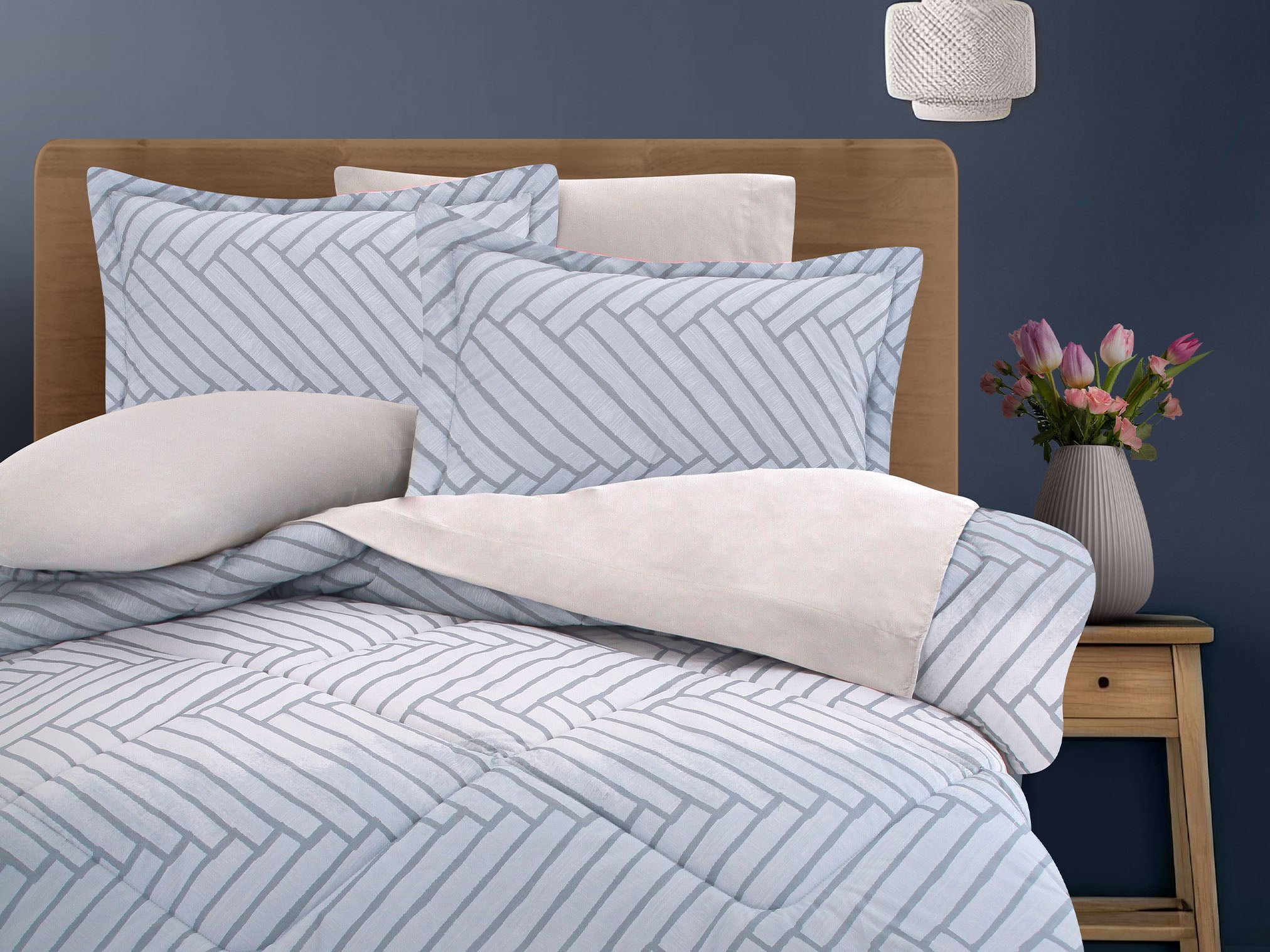 Rectángulos diagonales en un elegante tono gris oscuro se trazan con precisión sobre un fondo de franjas horizontales texturizadas, donde los matices de gris y blanco se entrelazan con sutileza. Este patrón geométrico juega con las líneas y las formas, creando un diseño dinámico que transmite modernidad y equilibrio. Un edredón que envuelve tu espacio en una atmósfera de sofisticación arquitectónica, donde cada detalle invita al descanso con un toque de estilo contemporáneo.
